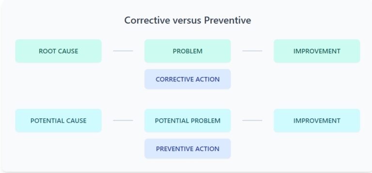 การปฏิบัติการแก้ไขเป็นการตอบสนอง ในขณะที่การปฏิบัติการป้องกันเป็นการดำเนินการเชิงรุก ทั้งสองส่วนมีความเชื่อมโยงกัน แต่เพื่อให้โครงสร้าง CAPA มีความครอบคลุมและมีประสิทธิภาพ ควรกำหนดให้เป็นกระบวนการแยกจากกัน เพื่อให้สามารถนำไปปฏิบัติแยกกันได้ตามความจำเป็น